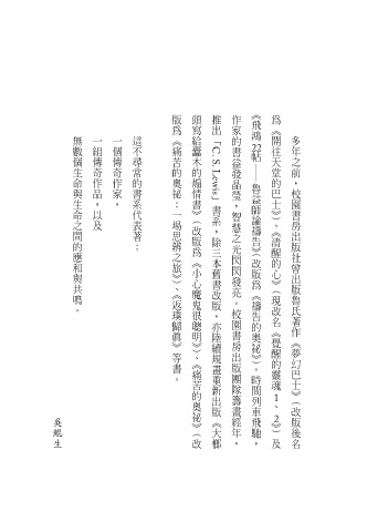 無數個生命與生命之間的應和與共鳴。 一組傳奇作品,以及 一個傳奇作家, 這不尋常的書系代表著: 多年之前,校園書房出版社曾出版魯氏著作︽夢幻巴士︾︵改版後名 儘管沒有當場決志,但寇氏重生之路就從那一刻向前展開。 寇爾森︵ 許多讀者的生命中,﹁魯益師﹂這個名字帶著溫度,一點也不冰冷。