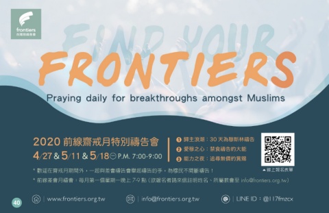 * 前線差會月禱會:每月第一個星期一晚上 7-9 點(欲報名者請來信註明姓名、所屬教會至 info@frontiers.org.tw)
