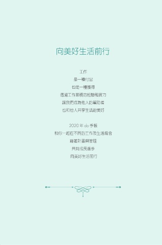 向美好生活前行 工作 是一種付出 也是一種獲得 透過工作累積的經驗和實力 讓我們成為他人的幫助者 也和他人共享生活的美好 2020 年 do 手帳 和你一起在不同的工作及生活場合 藉著計畫與管理 共同成長進步 向美好生活前行 001 2020-do內文.indd 1 2019/7/8 下午3:09