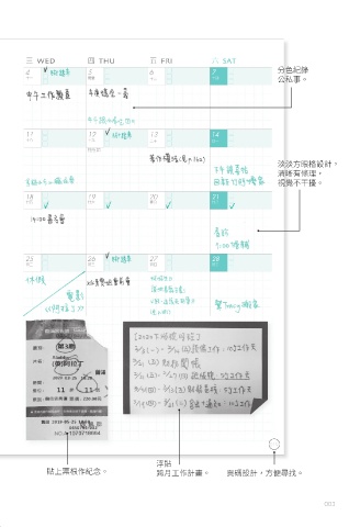 貼上票根作紀念。 跨月工作計畫。 頁碼設計,方便尋找。