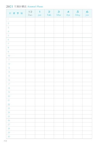 2021 年度計畫表 Annual Plans 12 1 2 3 4 5 6 7 8 9 10 11 12 1 2 3 計 畫 事 項 Dec Jan Feb Mar Apr May Jun Jul Aug Sep Oct Nov Dec Jan Feb Mar 1 2 3 4 5 6 7 8 9 10 11 12 13 14 15 16 17 18 19 20 21 22 23 24 25 26 27 28 29 30 008 EPʫ˖ JOEE ɪʹ