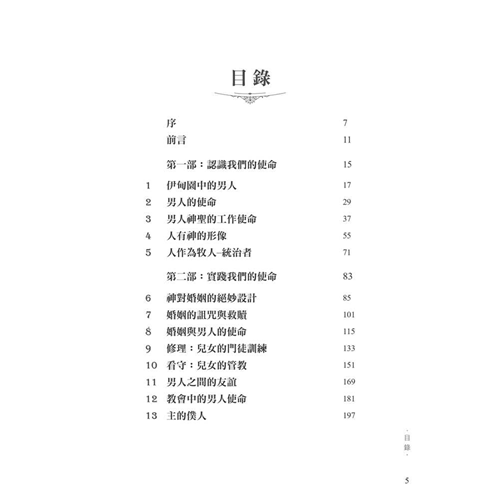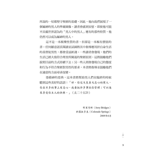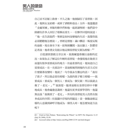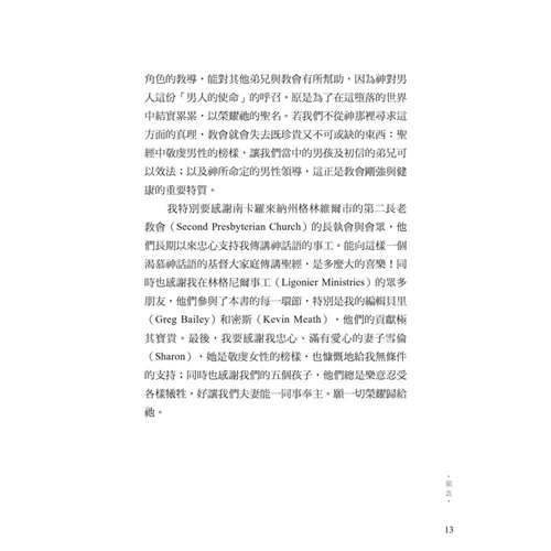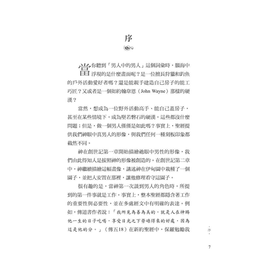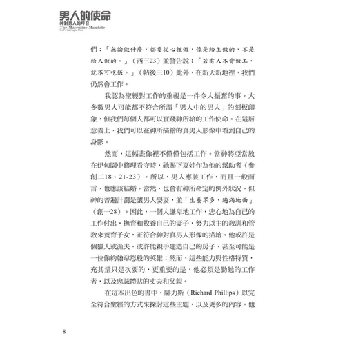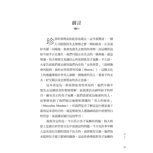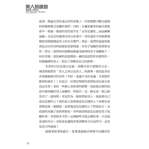 面對文化中的普遍迷失,作者引領我們回歸聖經中的男性本色──這種男子氣概立基於文化使命、十字架,並日常的蒙恩管道,指明男人的使命就是修理與看守所處的世界。他謹慎避免落入刻板及律法主義的規條,清晰、務實、簡明地揭示聖經如何看待男人,無論是談到男性個人的生命,或是跟其他弟兄建立友誼、對妻子和孩子的責任,以及在基督教會中的事奉。