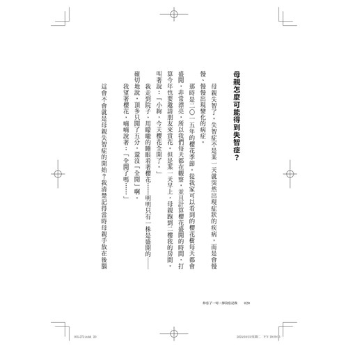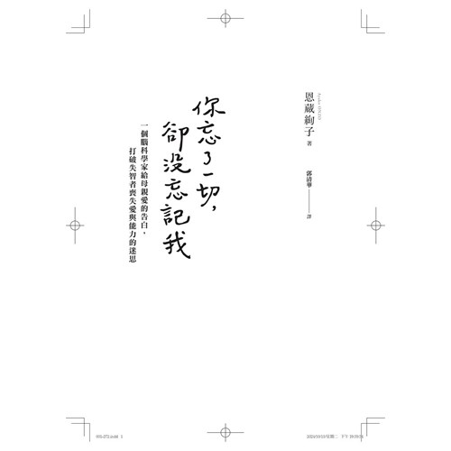 直到母親的症狀變得無法忽視,她決定運用自己的專業知識,正面迎擊這個被稱為「高齡社會世紀之癌」的絕症,更重要的是,探索心中那股強烈的不安:當家人失智時,我們到底在恐懼什麼?而當記憶逐漸消失了,母愛還在嗎?