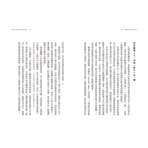 「世光以她專業心理師、諮商所所長的角度,用她溫暖的文字詳細地讓我們明白,通過眼光這一關,我們若細細省察,能夠成為更好的自己。這世上沒有人是完美,我們需要接納自己的不完美。」