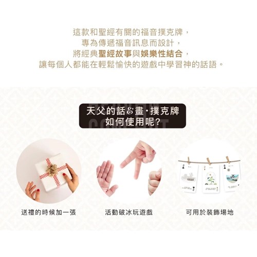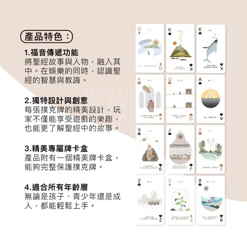 獨一無二的「天父的話&畫【撲克牌】」,專為傳遞福音而設計,將經典聖經故事與撲克牌的娛樂性質完美結合。