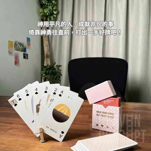神用平凡的人,成就非凡的事。這不僅是一副撲克牌,更是一個學習和分享福音的機會。倚靠神勇往直前,與家人和朋友一起,打出一手好牌,讓生活中充滿更多神的話語和祝福。立刻帶走這款撲克牌,開啟屬於您的神話時刻!