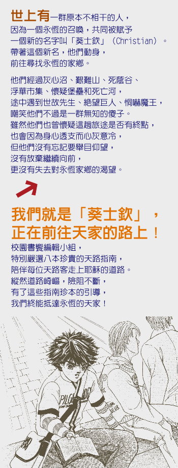 全世界最多人走過的路是哪一條嗎?不是天賦藝秉的羅琳,振筆如施展魔法而寫下的《哈利波特》,也不是深闇多國語言的托爾金,運用高度想像力打造出的《魔戒》,而是一位沒受過正規教育的浸信會牧師本仁約翰,因為傳道被下在監裡,花了十多年的時間,忠於聖經信息,醞釀出的百年經典《天路歷程》。不僅基督徒人手一本,連基督教圈子外都一致公認最偉大的英美文學作品!