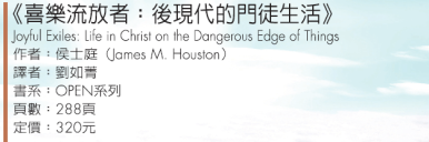 今年我們終於要出版侯士庭博士的《喜樂流放者》,在序言中他說明了這本書是要「見證八十年來我追隨基督所試圖活出的生命樣式」,這是應他兒子的要求而寫的,一個人的靈性生命,家人是看得最清楚的,兒子會作出這樣的邀請,可見侯士庭的信仰表裡一致。