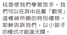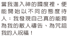 透過登山寶訓,司傑恩帶我們一一檢視天國生活的每一面,並藉由實際可行且豐富有趣的操練,走向日漸豐富的生活:透過好好地開心「玩耍」,我們操練更像小孩,能夠交託;藉由「守安息日」,放手讓神照顧我們,因而不再發怒;練習「禁戒媒體」,使神賜給我們的情慾能有好的方向;試著「一整天沉默」,好讓我們的口舌能操練不說謊!