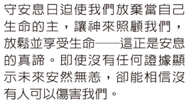 天國是美好而充滿力量的,神已經把它賜給我們,因著基督我們能活在當中;我們惟一需要做的,就是好好學習天國的價值觀:無論發生任何事,都不能使我們與神的愛隔絕!我們是神的孩子,是被接納、被深愛著的寶貴的人,一起練習在每個日常操練中,活出天國好生活。