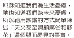 司傑恩告訴我們,原來這些對於美好的想像,都是「天國子民」的每日生活;福音的真諦,就是在於這些美好都是真實、可以實現的,基督已經邀請我們,踏上「與神同住在國度裡」的偉大旅程。