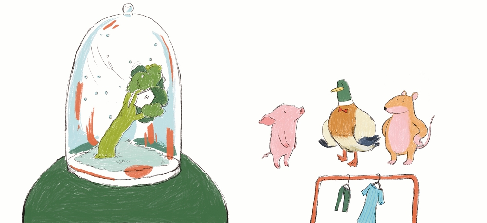 在畫禮物書的過程中,同時我也正好在和一位花藝師合作插畫,我手繪許多動物的紙偶來協助對方插花,我們一起在玻璃盅裡製作小小的動物森林或小花園。原本玻璃盅的用意是希望能好好保護脆弱的紙偶和永生花不被壓到,但這樣的畫面正好呼應我時常在人群中想把自己隱藏起來的心境。這次禮物書的其中一篇,就有一段上帝把破損的樹屋從玻璃盅移出種在草地上的敘述,因為上帝原本的心意就是要把樹屋種到土裡;等換到下一頁時,畫面就變成上帝其實是在傾聽小豬、和小豬說話。這段是我最喜歡的地方,因為每次禱告,上帝都讓我感覺自己和上帝在一個花園裡,在那裡,只有我和上帝面對面,祂總是專注聽我說話,我不用擔心自己說錯話,可以放心向祂傾訴。