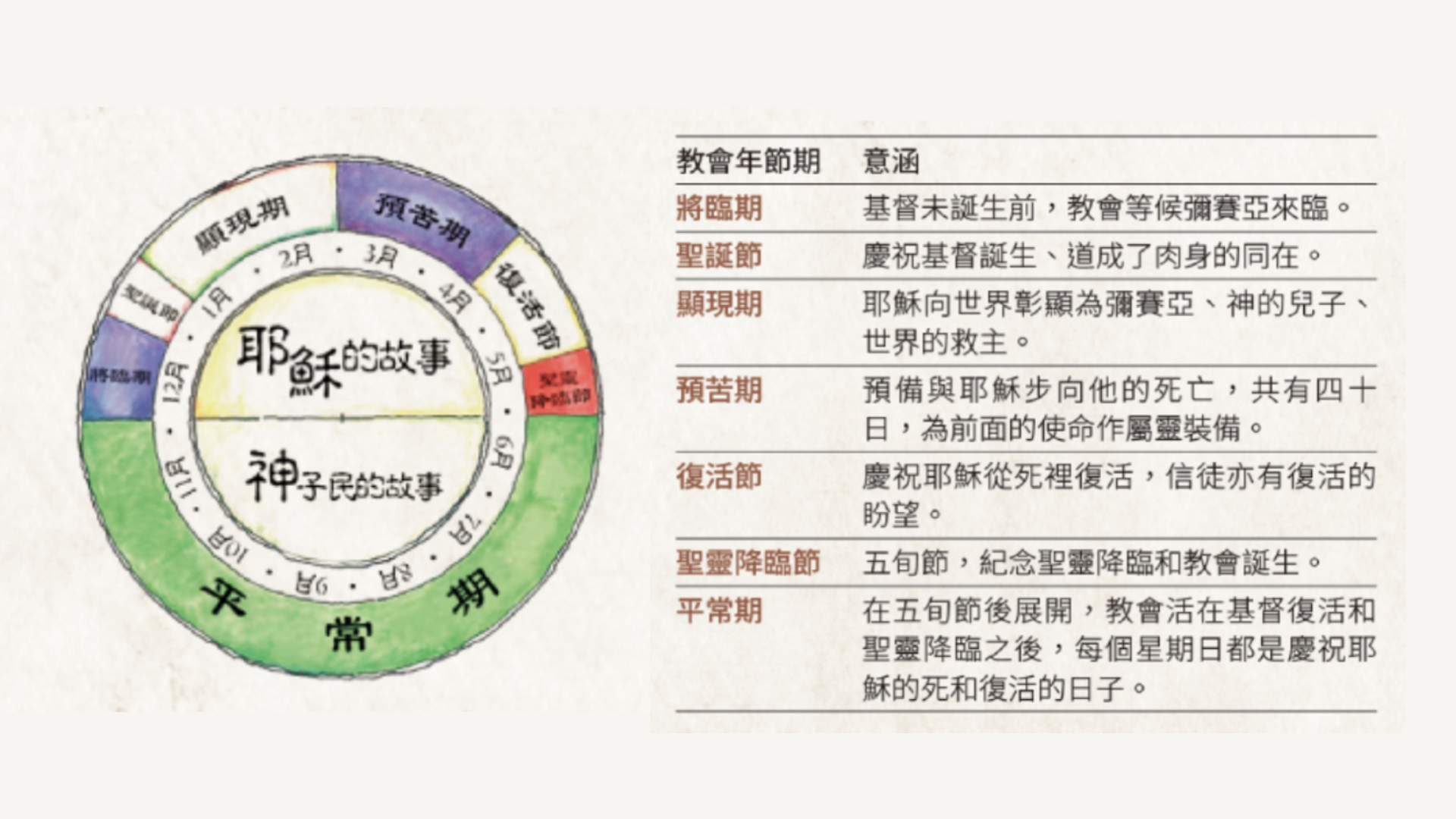 (前略)從以上「教會年的形成和經課的訂立」的討論裡,可知教會透過畫分時間,將神在耶穌基督裡的救贖工作分成幾個時期。在崇拜的處境裡,這就是表達教會認信耶穌基督的節期和慶典了。教會年的節期與福音書的配合,成為了經課編排的框架。以下是環繞基督生平的基本週期及節期: