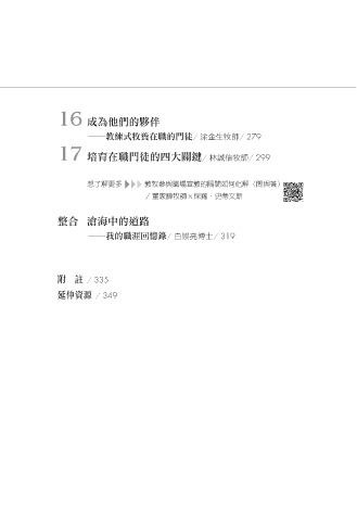 16 成為他們的夥伴 ─教練式牧養在職的門徒/ 涂金生牧師/ 279 17 培育在職門徒的四大關鍵/ 林誠信牧師/ 299 想了解更多 ▼ ▼ ▼ 教牧參與職場宣教的隔閡如何化解(問與答) / 董家驊牧師×保羅.史蒂文斯 整合 滄海中的道路 ─我的職涯回憶錄/ 白崇亮博士/ 319 附 註 / 335 延伸資源 / 349 ࣧ Ò " Դնژࢯٙᔖఙ͛ݺ Q @5 ࣧ JOEE ɨʹ 2024/2/20 下午2:45 目錄頁.indd 20