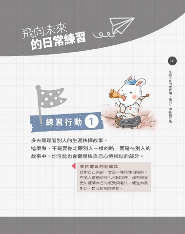 飛向未來 的日常練習 037 在看不見的世界裡,擁抱生命各種可能 練習行動 � 多去聽聽看別人的生涯抉擇故事。 這麼做,不是要你走跟別人一樣的路,而是在別人的 故事中,你可能也會聽見與自己心境相似的部分。 來自前輩的經驗談 這對自己來說,會是一種同理和接納。 在他人遭遇的掙扎和困境裡,你有機會 更加釐清自己的感受與看法,促進自我 對話、自我探索的機會。 " ʫ˖ JOEE ɪʹ " ʫ˖ JOEE ɪʹ