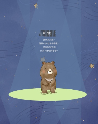 大仔熊 觀察系玩家, 話雖不多但性格穩重, 總是默默完成 大家不想做的事情。 ɪʹ " ʫ˖ JOEE ɪʹ " ʫ˖ JOEE