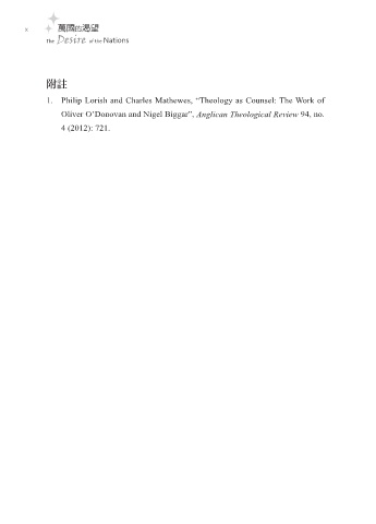 x 萬國的渴望 The Desire of the Nations 附註 1. Philip Lorish and Charles Mathewes, “Theology as Counsel: The Work of Oliver O’Donovan and Nigel Biggar”, Anglican Theological Review 94, no. 4 (2012): 721. 2 ຬٙಸૐ ࠫ ̬ࣧ JOEE ɪʹ