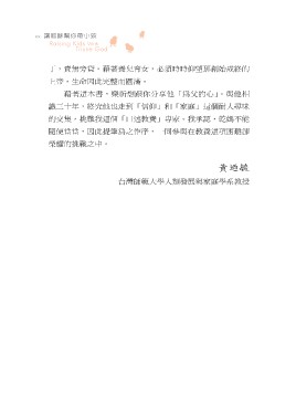xx Raising Kids With Triune God 丁,責無旁貸。藉著養兒育女,必須時時仰望那創始成終的 上帝,生命因此完整而圓滿。 藉著這本書,樂祈想跟你分享他「為父的心」。與他相 識三十年,終究他也走到「信仰」和「家庭」這個耐人尋味 的交集,挑戰我這個「口述教養」專家。我承認,乾媽不能 隨便當當,因此提筆為之作序,一同參與在教養這項困難卻 榮耀的挑戰之中。 台灣師範大學人類發展與家庭學系教授