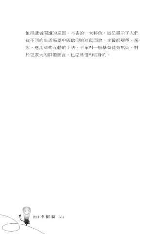 值得讀者閱讀的原因。本書的一大特色,就是展示了人們 在不同的生活場景中與信仰的互動面貌。李醫師解釋、探 究、應用這些互動的手法,不單對一般基督徒有幫助,對 於更廣大的群體而言,也是易懂和切身的。 ڦ 不倒翁 004 校園-25K-A1662信仰不倒翁-(P1-6+P1-218)-FX_4校pr2.indd 4 2019/7/1 下午 02:43:08