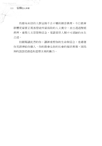 The Beliefs that Re-invents the Future 020 信仰的大未來 為要向未信的人群宣揚千古不變的福音真理,今日教會 群體更需要正視基督徒所需汲取的人文養分,並且透過聖經 真理,重塑人文思想與信念,見證普世人類不可或缺的永生 之道。 但願閱讀此書的你,讓神重塑你的生命與信念,也藉著 你見證神給你個人、你的教會及你的社會的福音真理,因為 神的話語是創造和重塑未來的動力。 ࣧ , " ڦٙɽ͊Ը 1 :"@ ࣧQS JOEE ɨʹ
