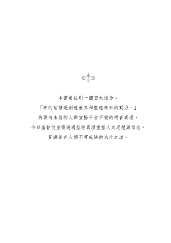 本書要說明一個宏大信念: 「神的話語是創造世界和塑造未來的動力。」 為要向未信的人群宣揚千古不變的福音真理, 今日基督徒亟需透過聖經真理重塑人文思想與信念, 見證普世人類不可或缺的永生之道。 " ڦٙɽ͊Ըوۨ JOEE ɨʹ