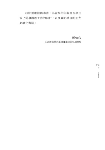 我鄭重地推薦本書,為在學的年輕護理學生 或已從事護理工作的同仁,以及關心護理的朋友 必讀之書籍。 鍾信心 前高雄醫學大學護理學院兼任副教授 推薦 序 0 0 0 ࣧ یɕࣸဧၾڐ˾ᚐଣ 1 :"@ ࣧQS JOEE ɪʹ